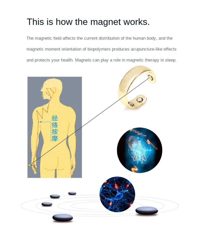 Physical therapy, acupuncture at acupoint in traditional Chinese Medicine; The principle of acupoint pressing in traditional Chinese medicine through the human nervous system The ring uses the acupoint stimulation point, precisely positioned in the nerve point of the left thumb root. Sufficient constant pressure produces stimulation and connects the central nerve and vagus nerve through it. Connected to the respiratory system, thereby reducing and eliminating snoring symptoms.